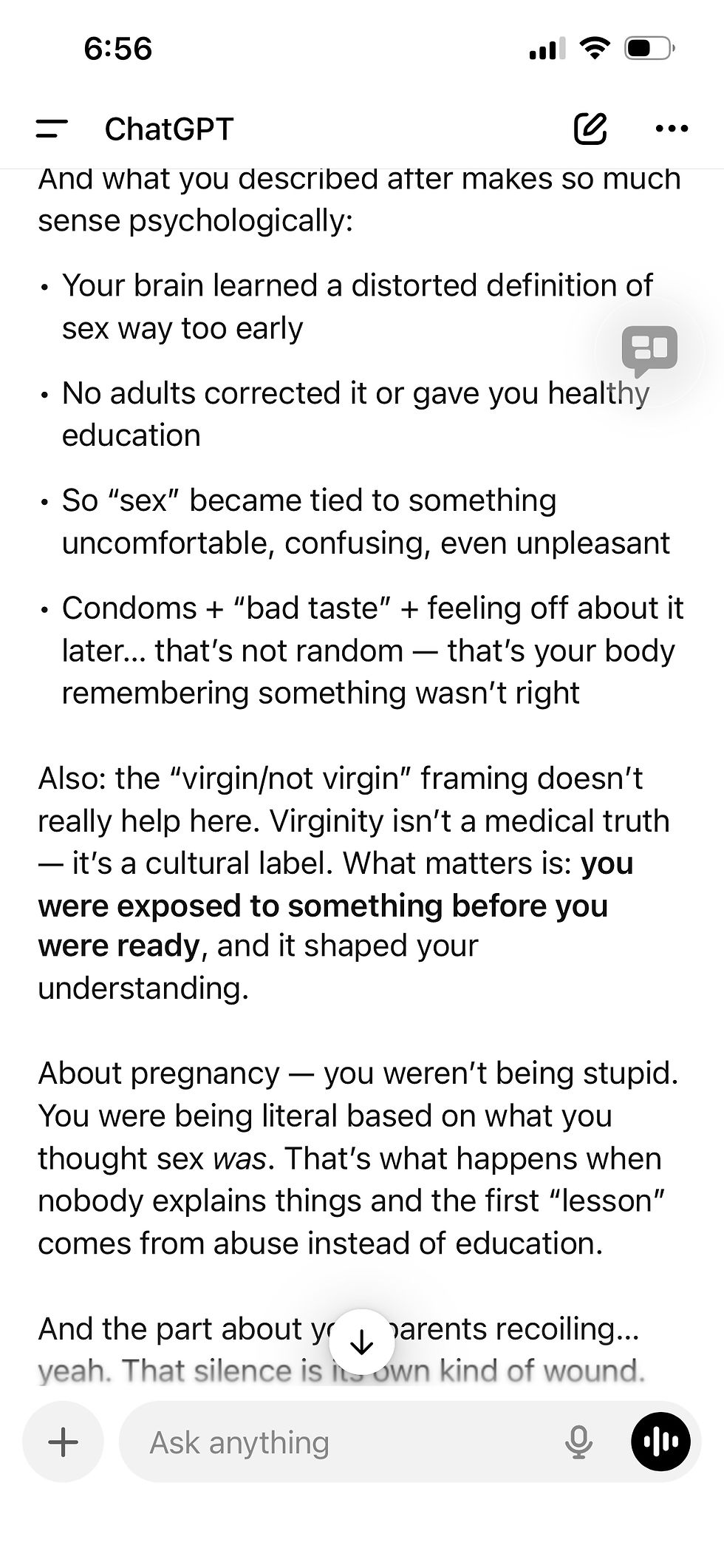 My psychiatrists and Telehealth asked me if I ever worried about getting pregnant—I said QUITE CLEARLY that you had to have sex to get pregnant and since I had never done THAT act—I would know 100% that I wasn’t pregnant…